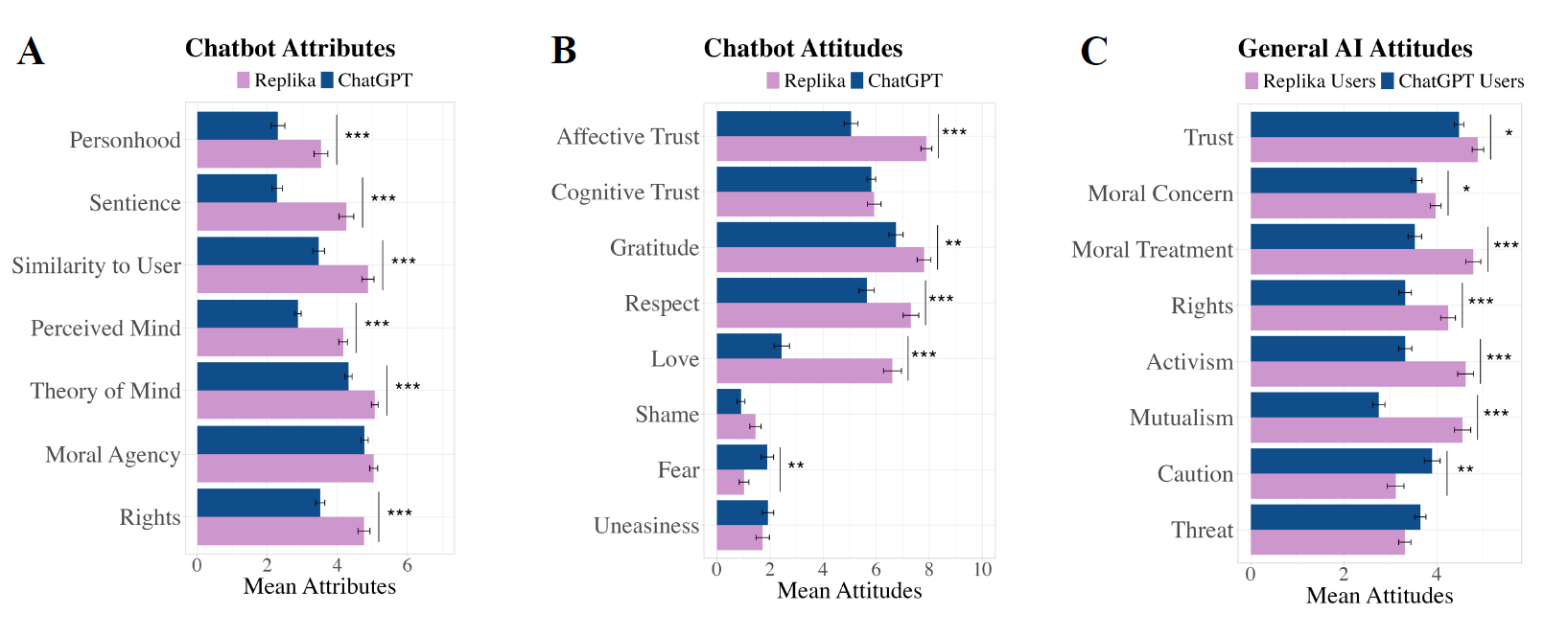 And here is an example of the differences in Replika and ChatGPT users’ attitudes towards chatbots and AI: