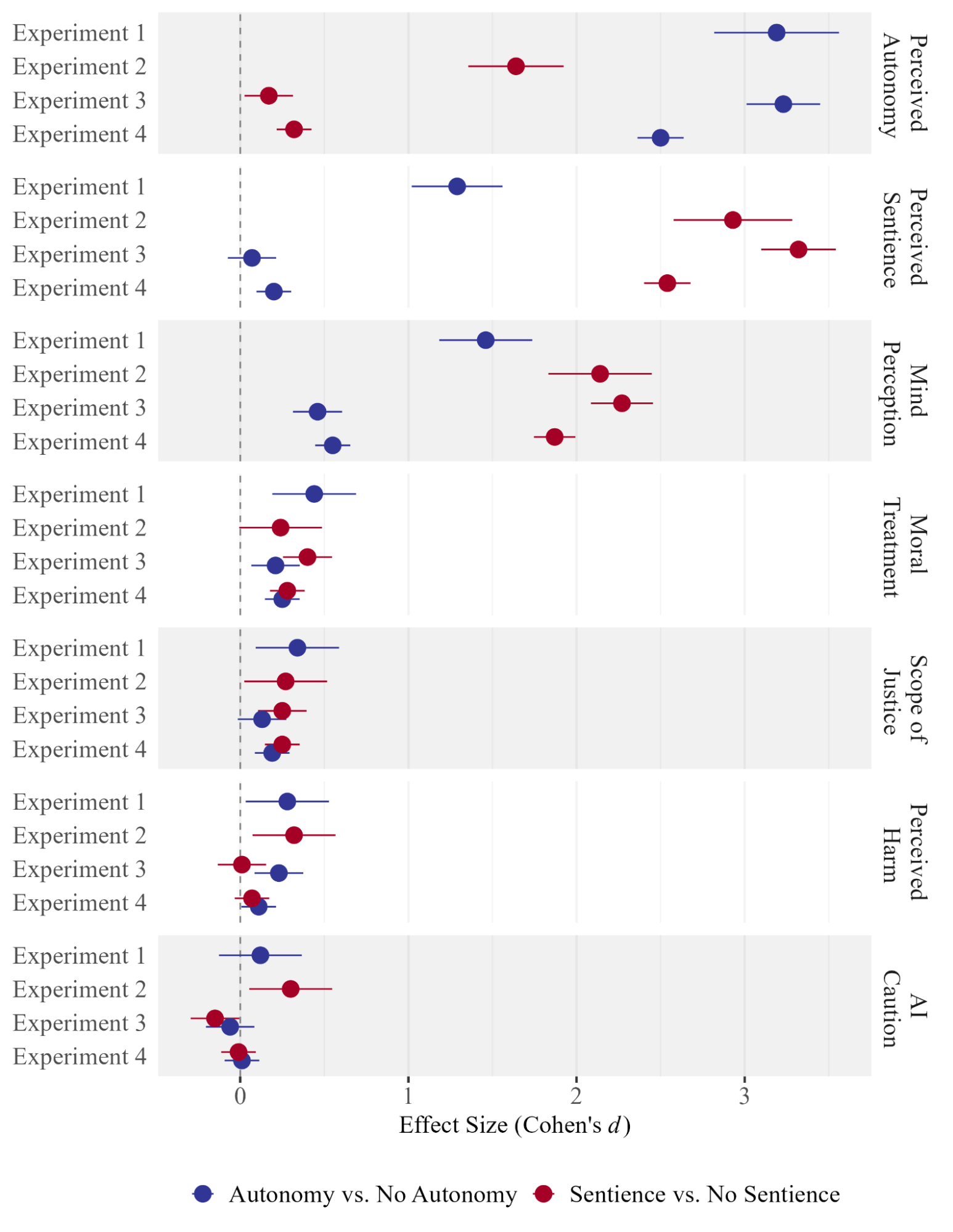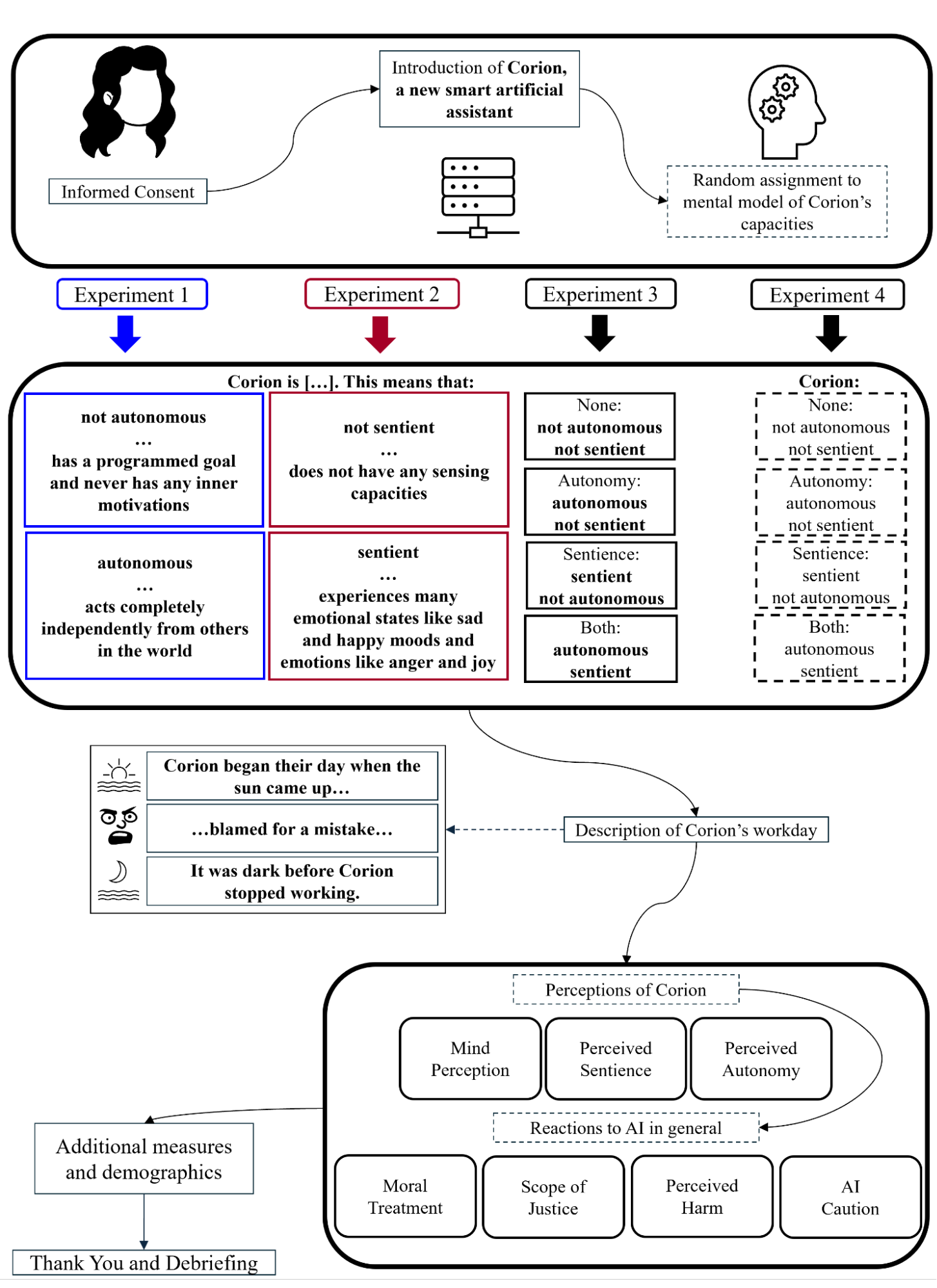 Mental models of autonomy and sentience may be activated by interactions with AI agents that perform tasks autonomously and companions that recognize and express emotions, respectively, provoking distinct reactions. Here is a breakdown of our experimental methodology disentangling autonomy and sentience as described in our preprint: