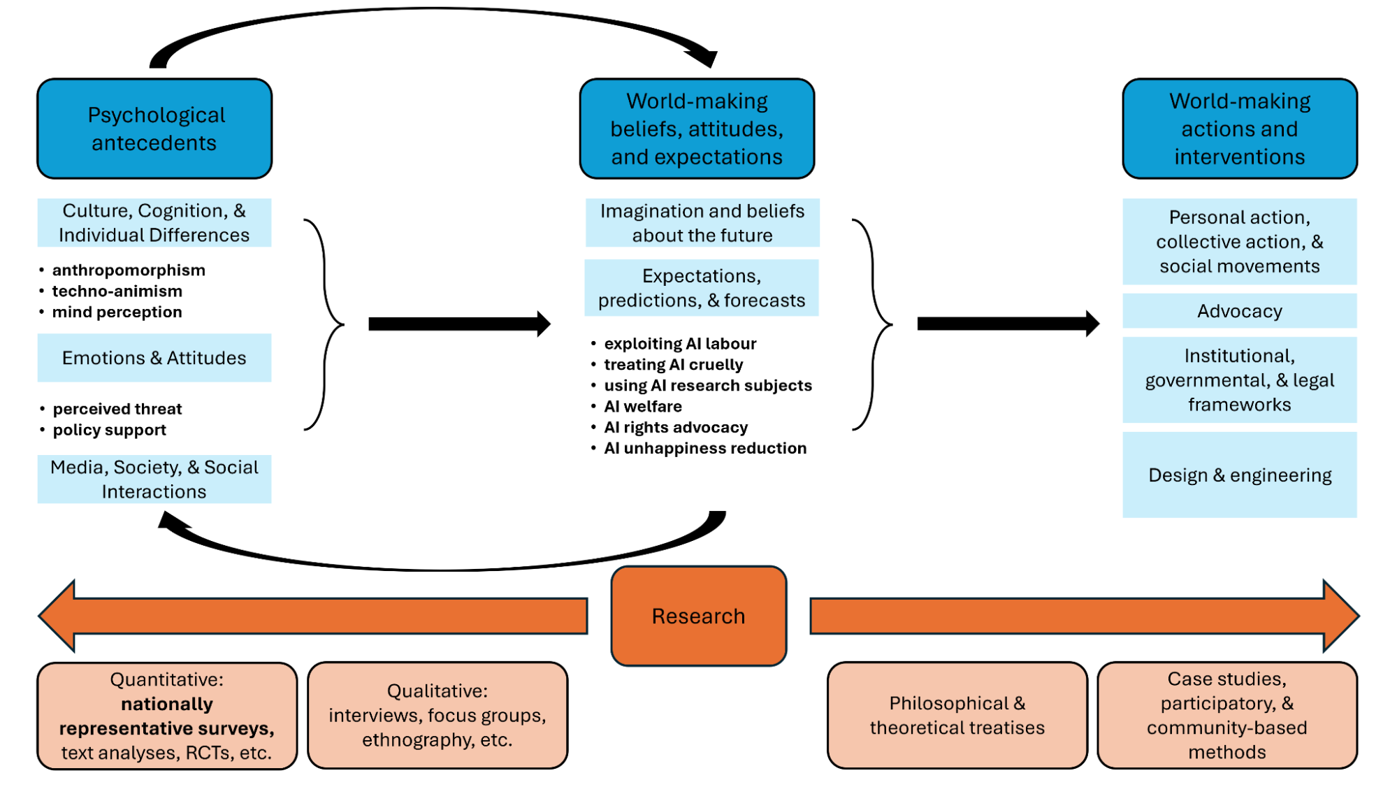 Imagining futures with AI affects “world-making”—the production of the future through cultural propagation, design, engineering, policy, and social interaction. In the AIMS survey, we probe expectations for futures with digital minds. Here is our theoretical model from Pauketat et al. (2025):