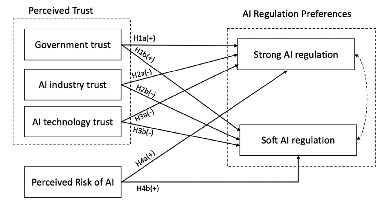 Trust in the government, trust in the AI industry, trust in AI systems, and perceptions of AI risks predict strong (e.g., banning data centers, AI sentience development) and soft (e.g., slowing down AI development) regulatory policies. Here is our theoretical model from Bullock et al. (2025):