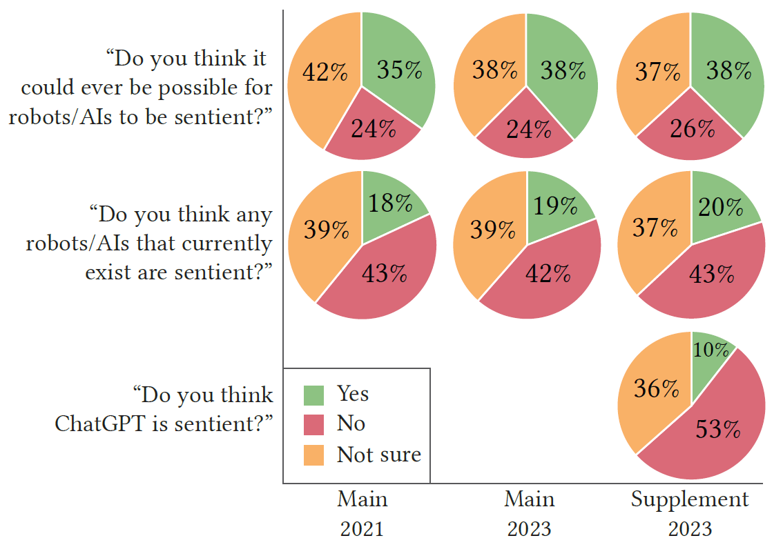 Perceptions of mind and moral concern for AI welfare were surprisingly high in 2021, and significantly increased from 2021 to 2023. Here is a figure showing perceptions of AI sentience from Anthis et al. (2025):